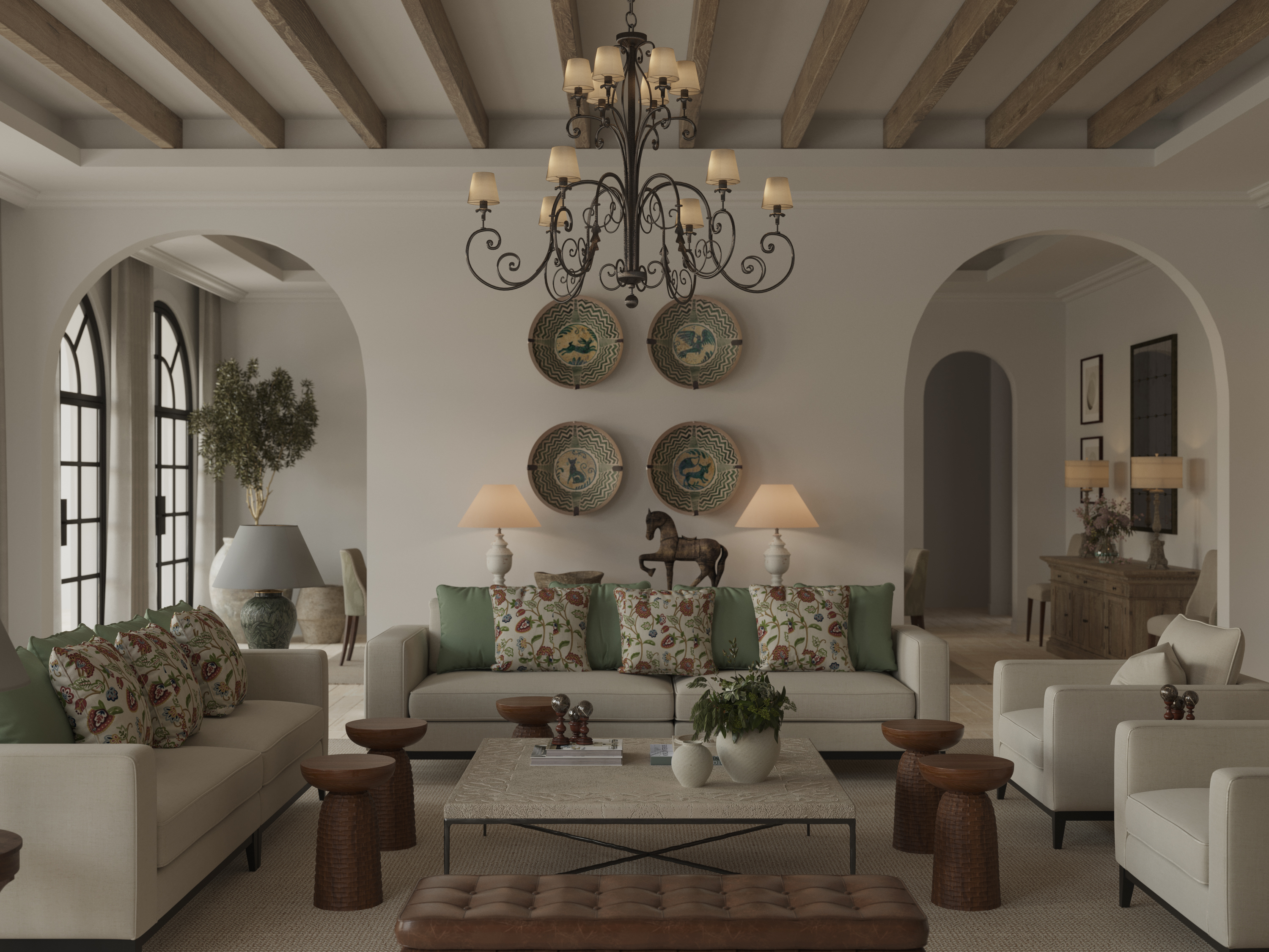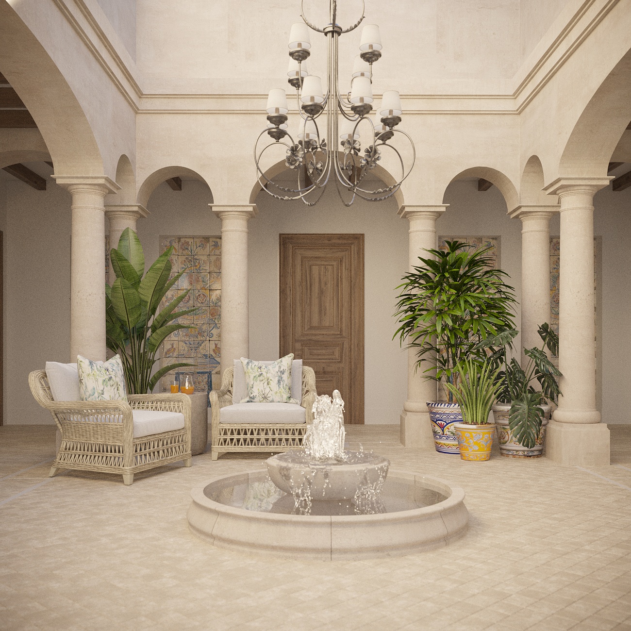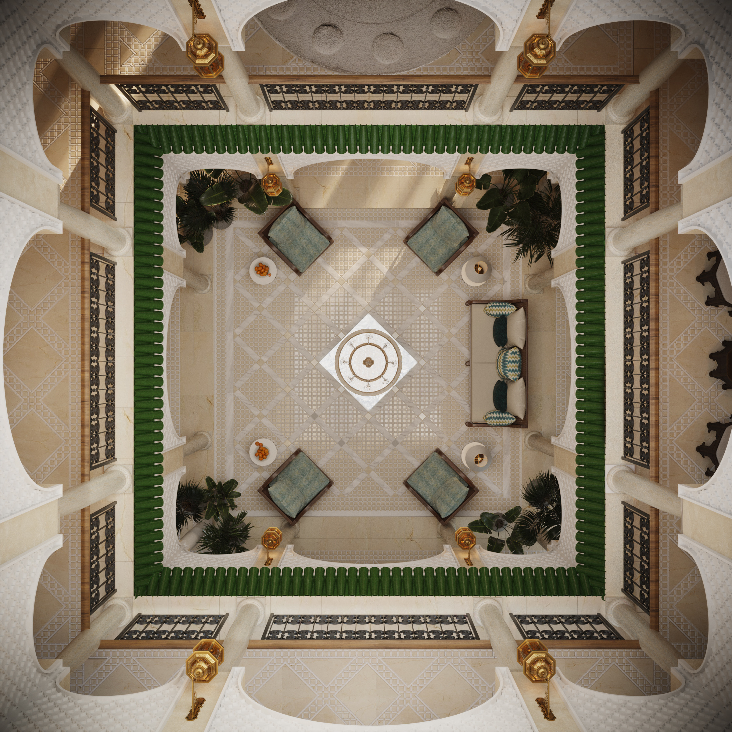One of the most distinctive features of Andalusian architecture is the patio, a central courtyard that serves as the heart of the home. These spaces are designed to be both functional and beautiful, providing a private outdoor area that offers respite from the hot Andalusian sun that translate fabulously into the Middle East. Often, patios are adorned with fountains, lush plants, and decorative tiles, creating a serene oasis.