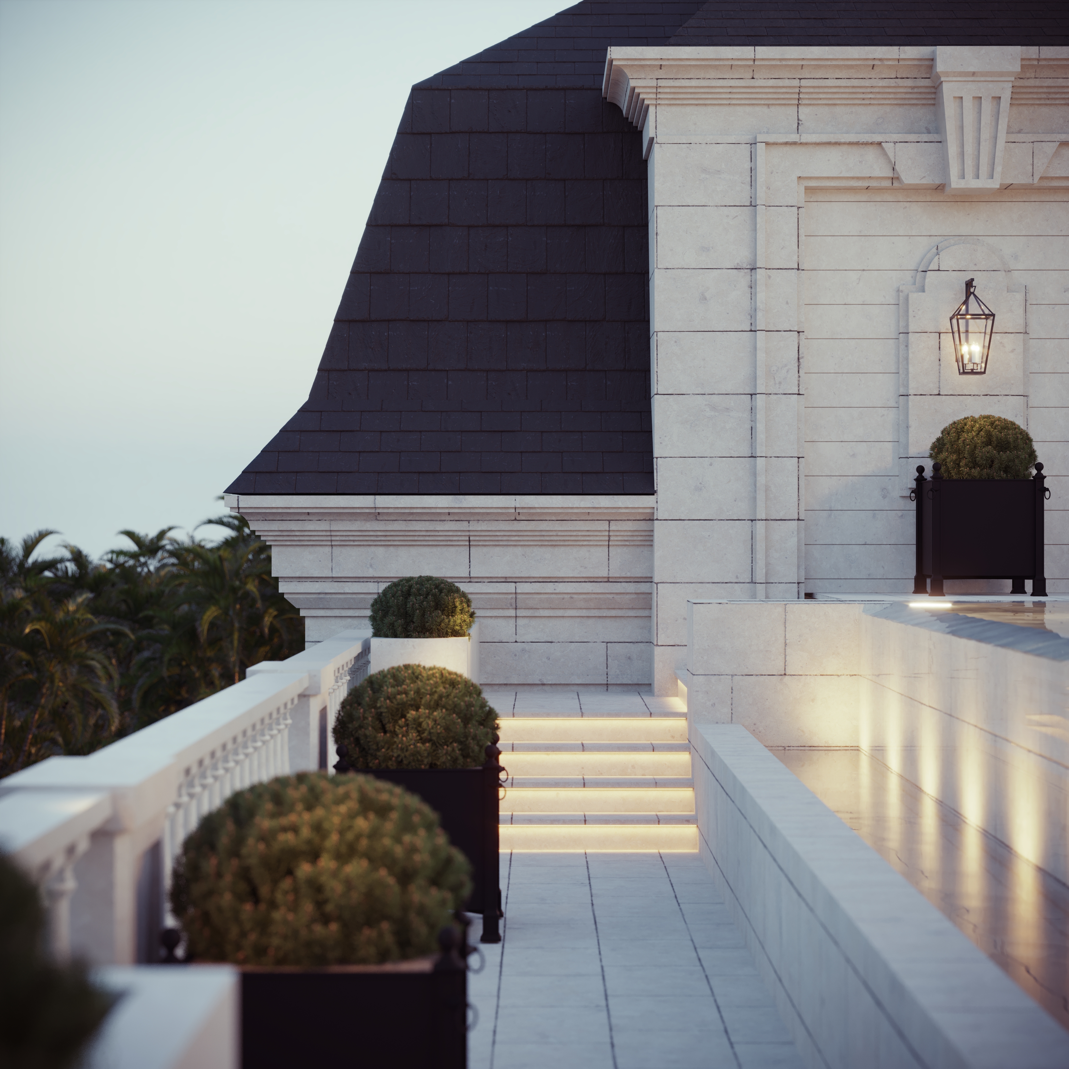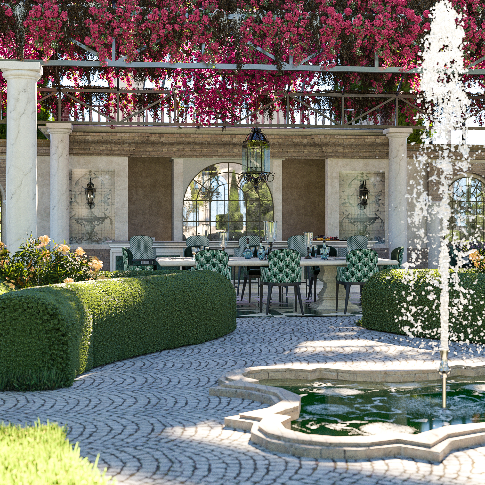 Central courtyards and water features are essential elements in both Andalusian & Middle Eastern styles. DME designs courtyards that combine the lush greenery of Andalusian patios with the tranquil water features of Middle Eastern gardens. Fountains, reflecting pools, and mosaic tiles create a serene and picturesque environment.